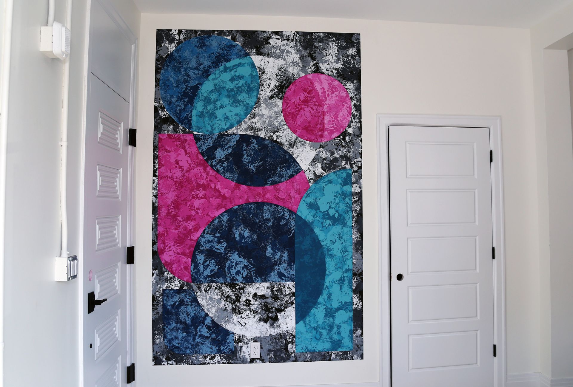 The bold graphic colorscapes, defined edges, line-work and movement are referential of Moya’s background in illustration and lettering. She describes her paintings as “abstract storytelling,” influenced by how Frank Stella described his own work, saying: “[Abstraction] could have a geometry that had a narrative impact. In other words, you could tell a story with the shapes.” Each of Moya’s works are a push and pull between intuition and control. It is a performance by and for the artist, reflecting identity back on oneself to simulate comfort and stability in the face of fear and loss of control.